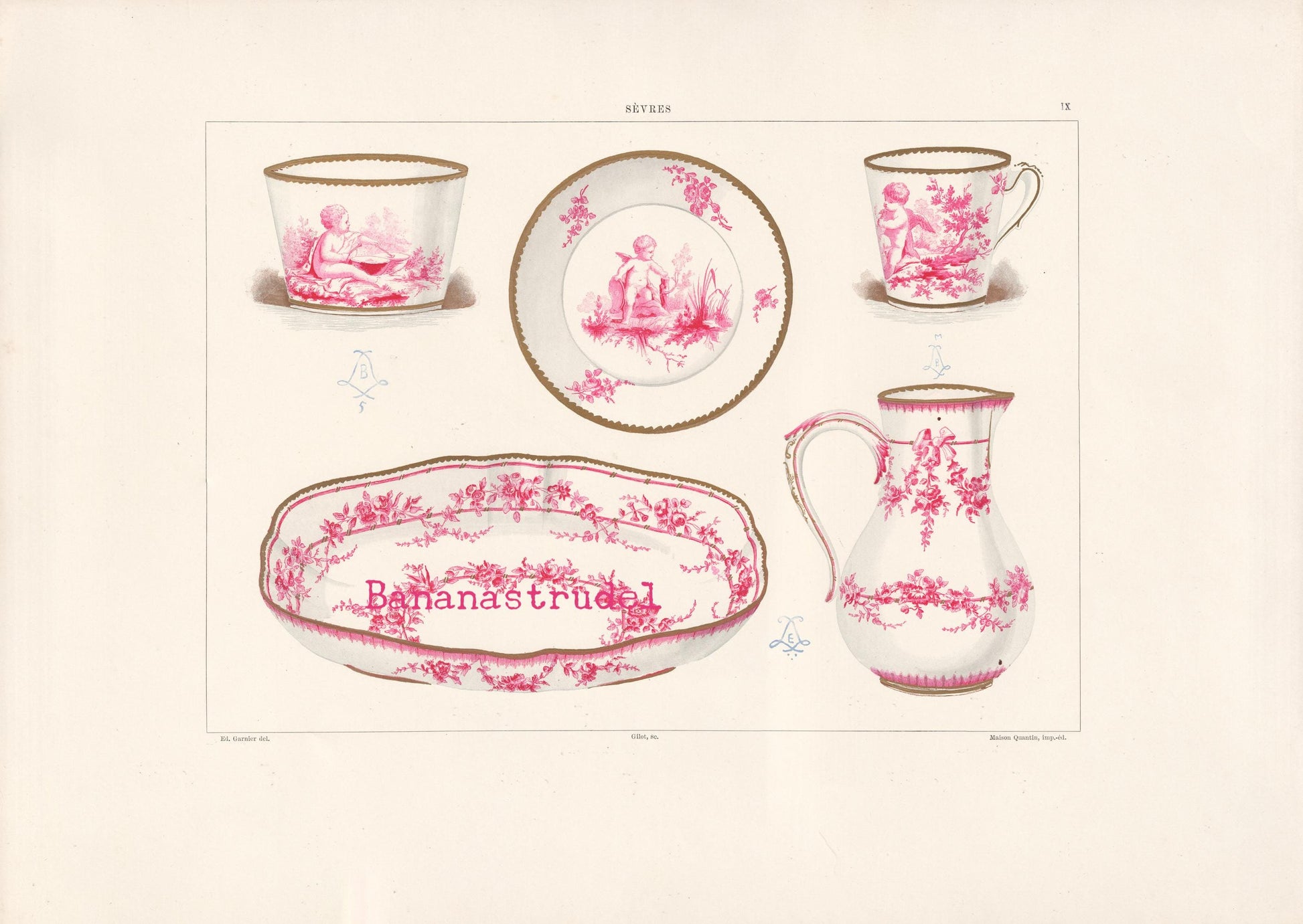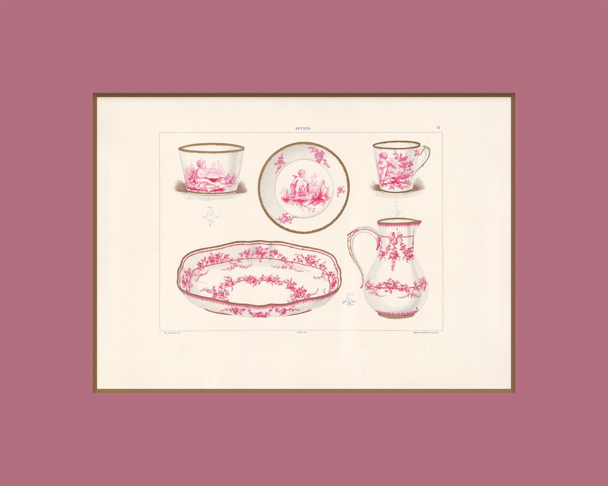 This rare large print comes from the book "La Porcelaine Tendre de Sèvres" ("The Soft Porcelain of Sevres"), which collected 50 chromolithographs of products of the famous Sévres porcelain factory, engraved by Parisian printer Maison Quantin (the name appears at the bottom right of the print). The chromolithographs were based on paintings by Edouard Garnier (whose name is shown at the bottom left of the print), French artist and curator of the Museum of Ceramics and Collections. These prints are rare, as less than 300 copies of the folio were produced.