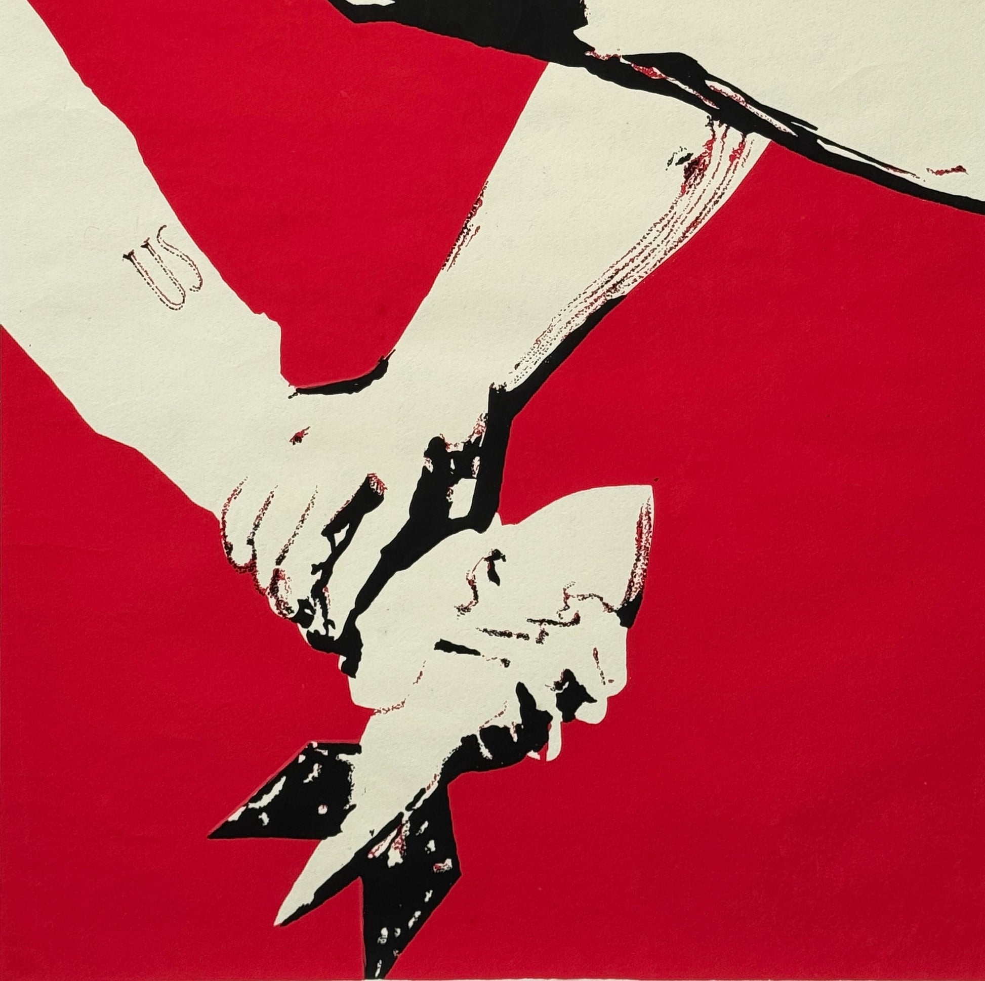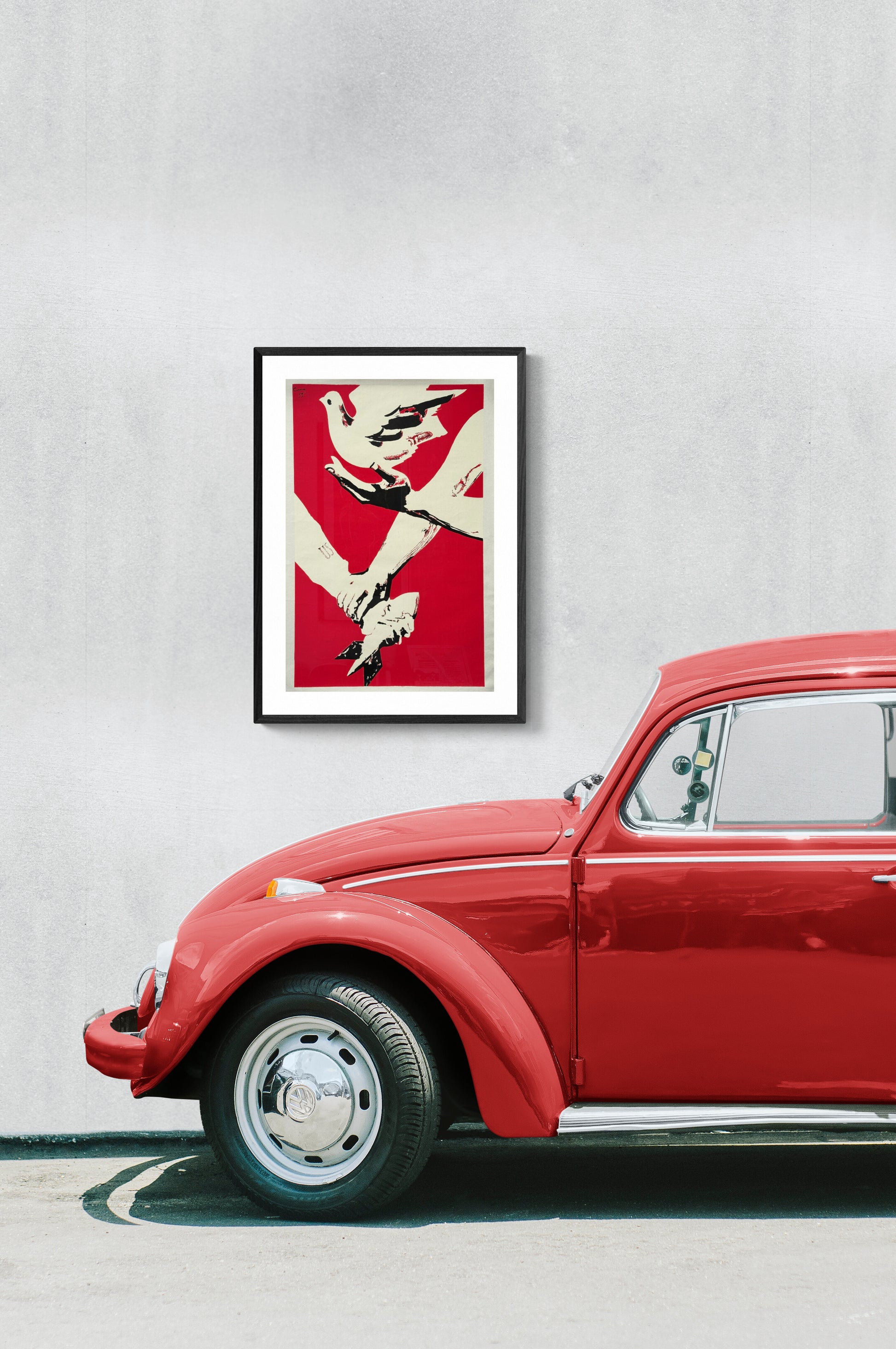 This large red, visually striking poster (date unknown, although "59" is indicated beside the artist's signature) is handpainted on rice paper and measures approximately 18 inches x 27 inches (45.72 cm x 68.58 cm).