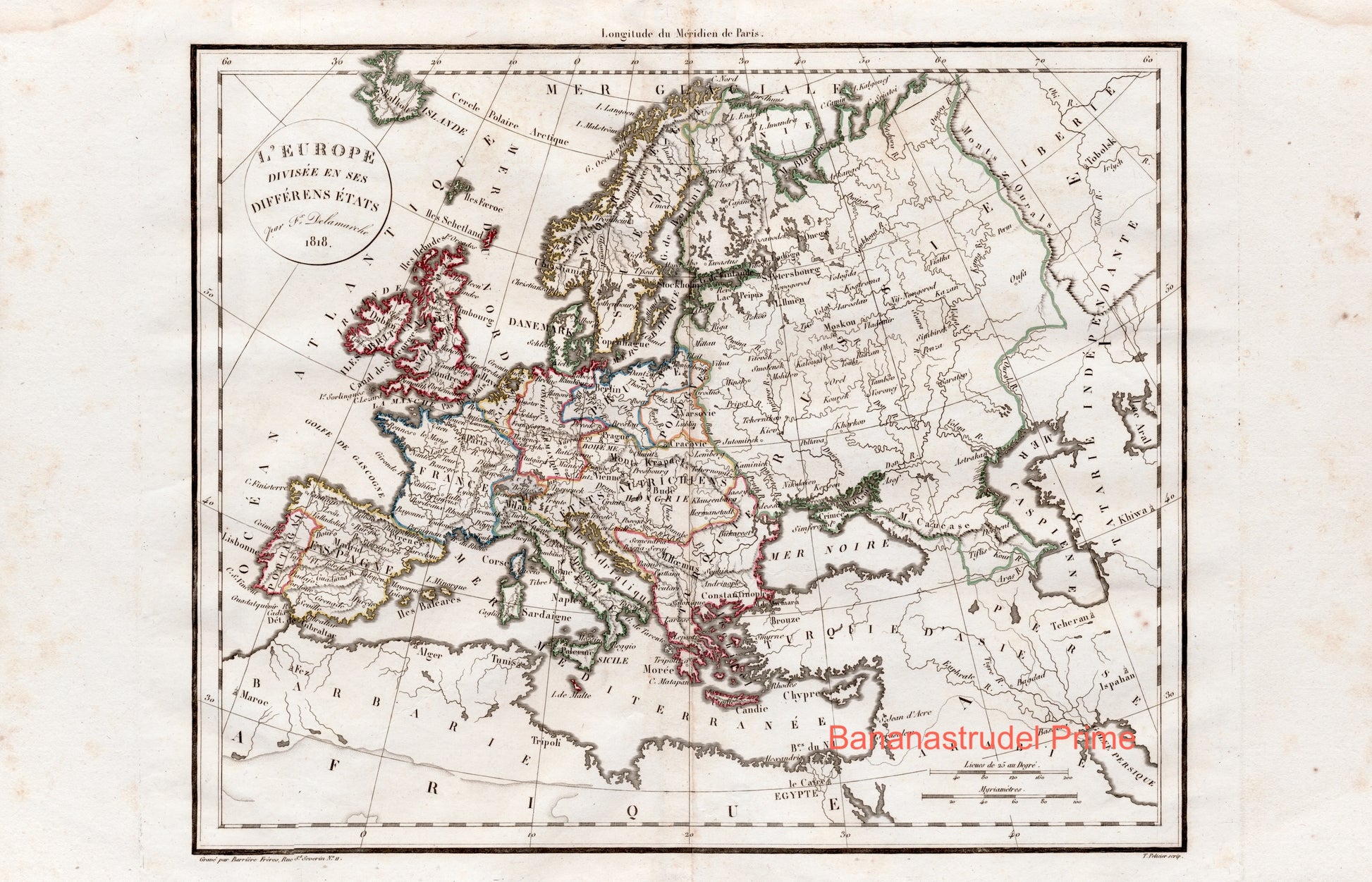 Vintage Map of Europe - 1818 Hand Coloured Vaugondy/Delamarche Map (ET)